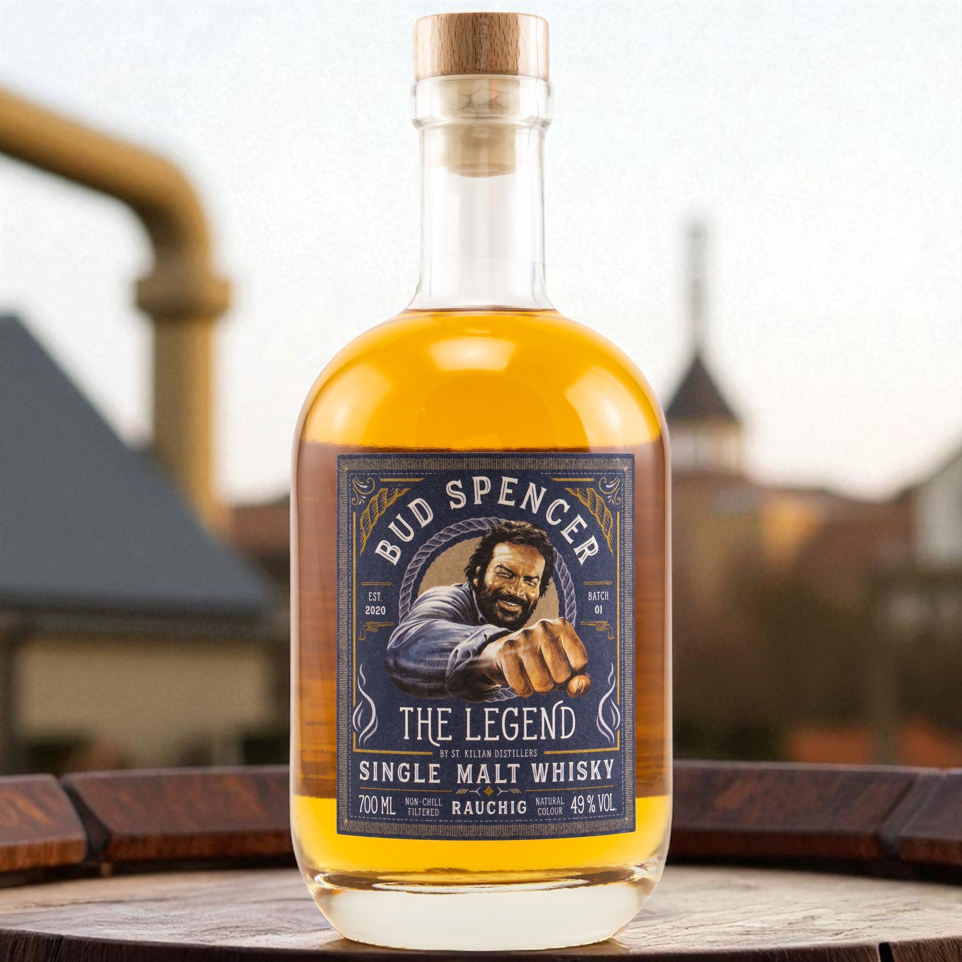 Die beliebte und rauchige Variante der Bud Spencer-Flasche von St. Kilian. In seinen Filmen trank der berühmte Schauspieler als Belohnung gerne mal einen wohlverdienten Whisky. Wie die anderen Abfüllungen aus dem Hause St. Kilian reift die rauchige sowohl in Bourbonfässern als auch in italienischen Amarone Rotweinfässern.